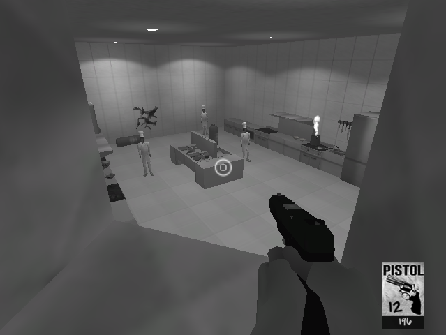 Shortly into the level a very video-game-y laser fence blocks the way, showing that things aren't what they seem. When turning into a side room to collect a key, the player pulls out a pistol and the HUD appears. It's an FPS! From here the stage proceeds as a normal single player FPS in the style of something like Goldeneye. The blood effects are red, contrasting with the usual monochrome graphics.